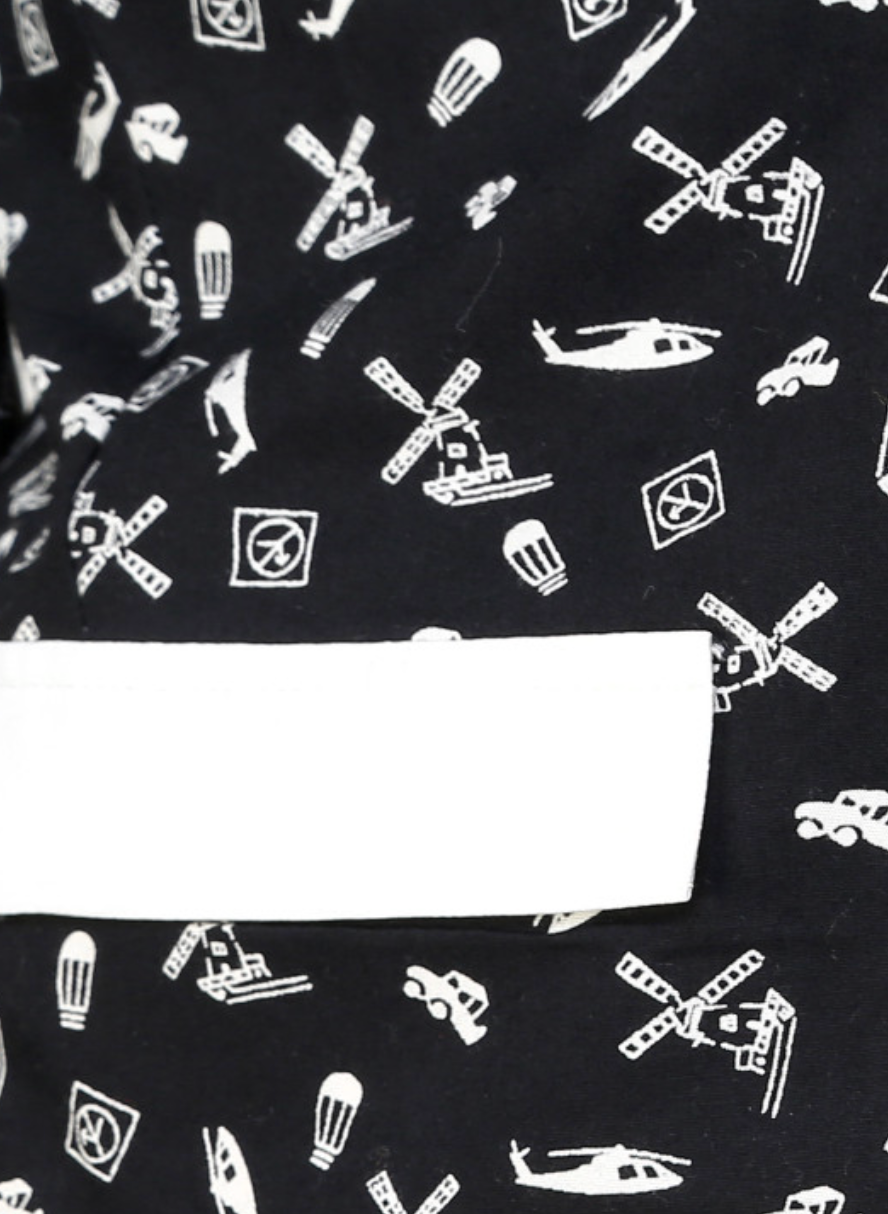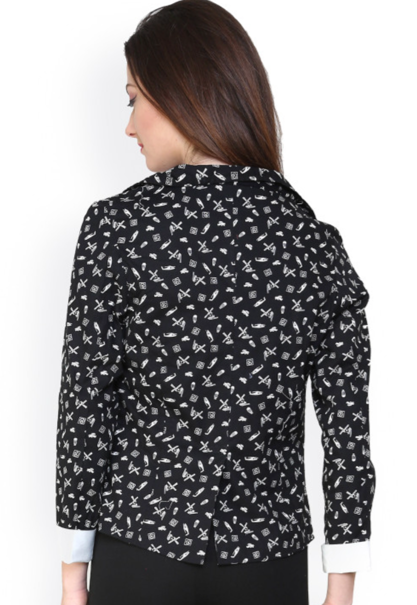 Black printed blazer, has a notched lapel, a button closure on the front, long sleeves, two mock welt pockets, a dipped hem