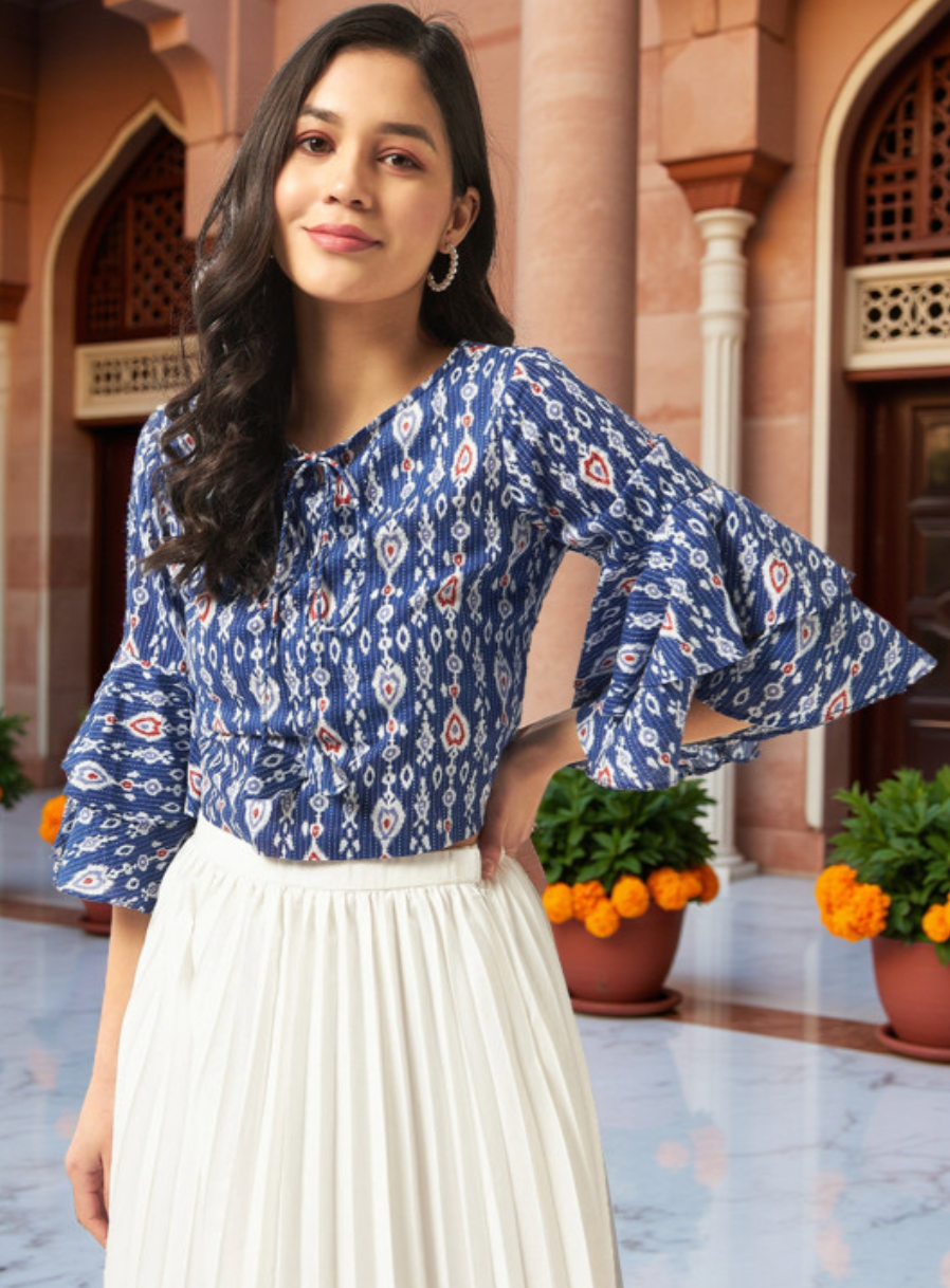 Blue regular top with floral print, round neck, three-quarter bell sleeves, and woven cotton fabric.