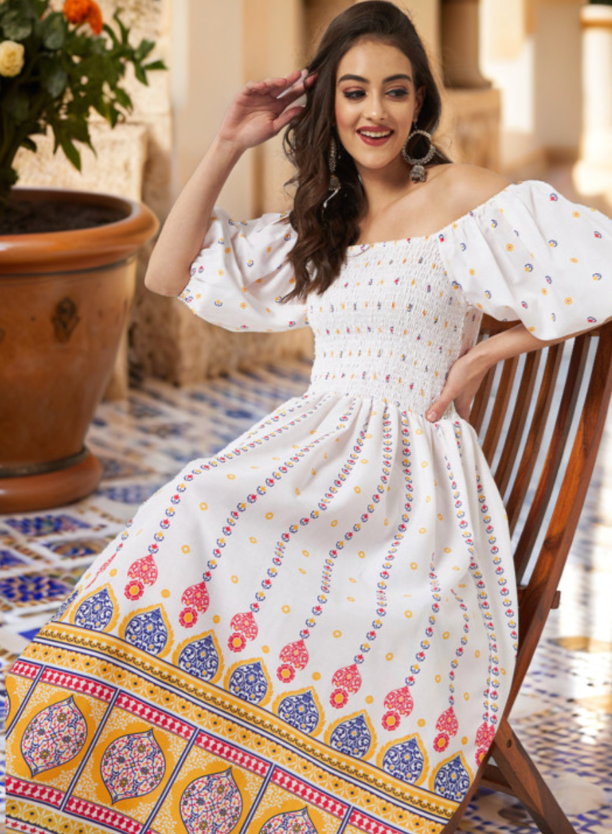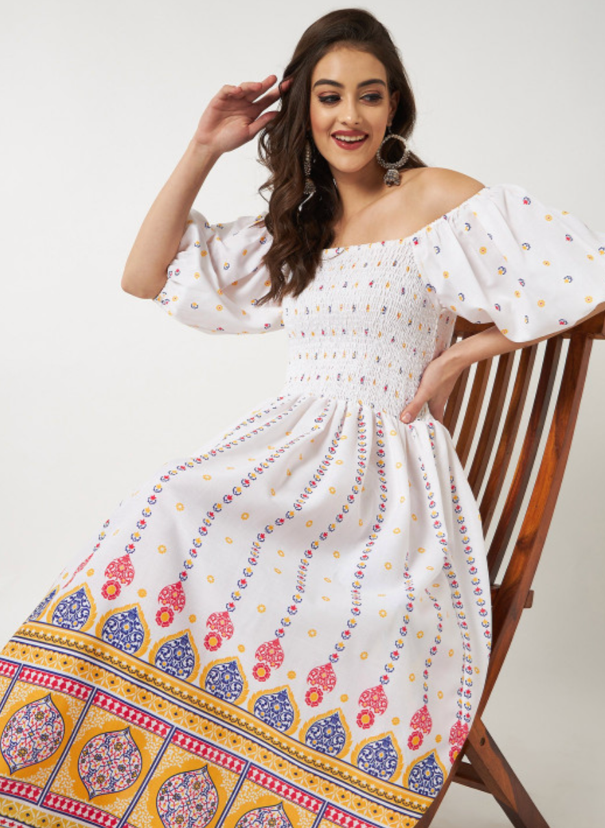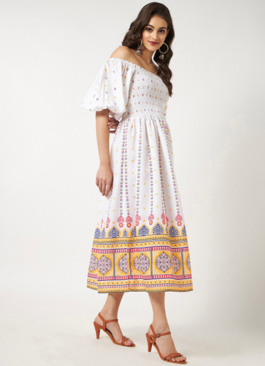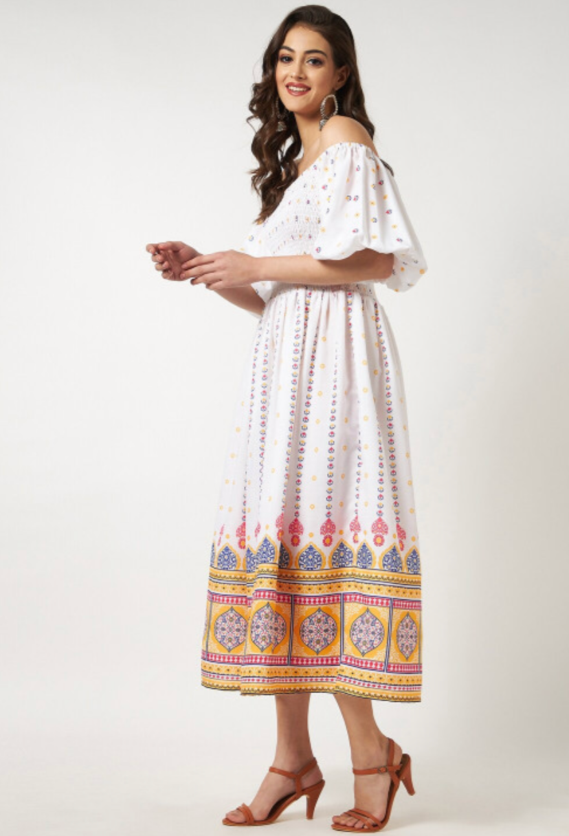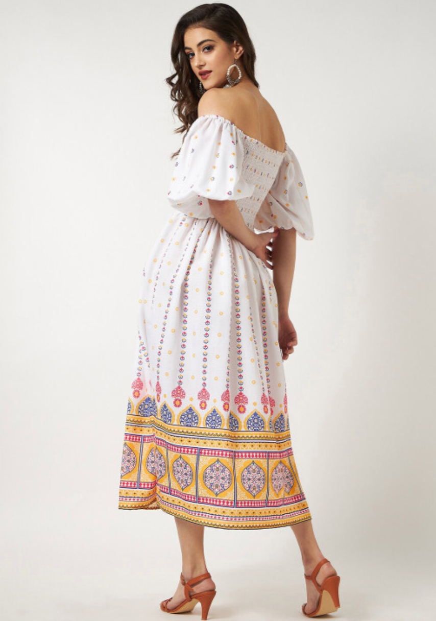 Ethnic motifs print fit and flare dress with an off-shoulder design, short puff sleeves, and midi length in a flared hem
