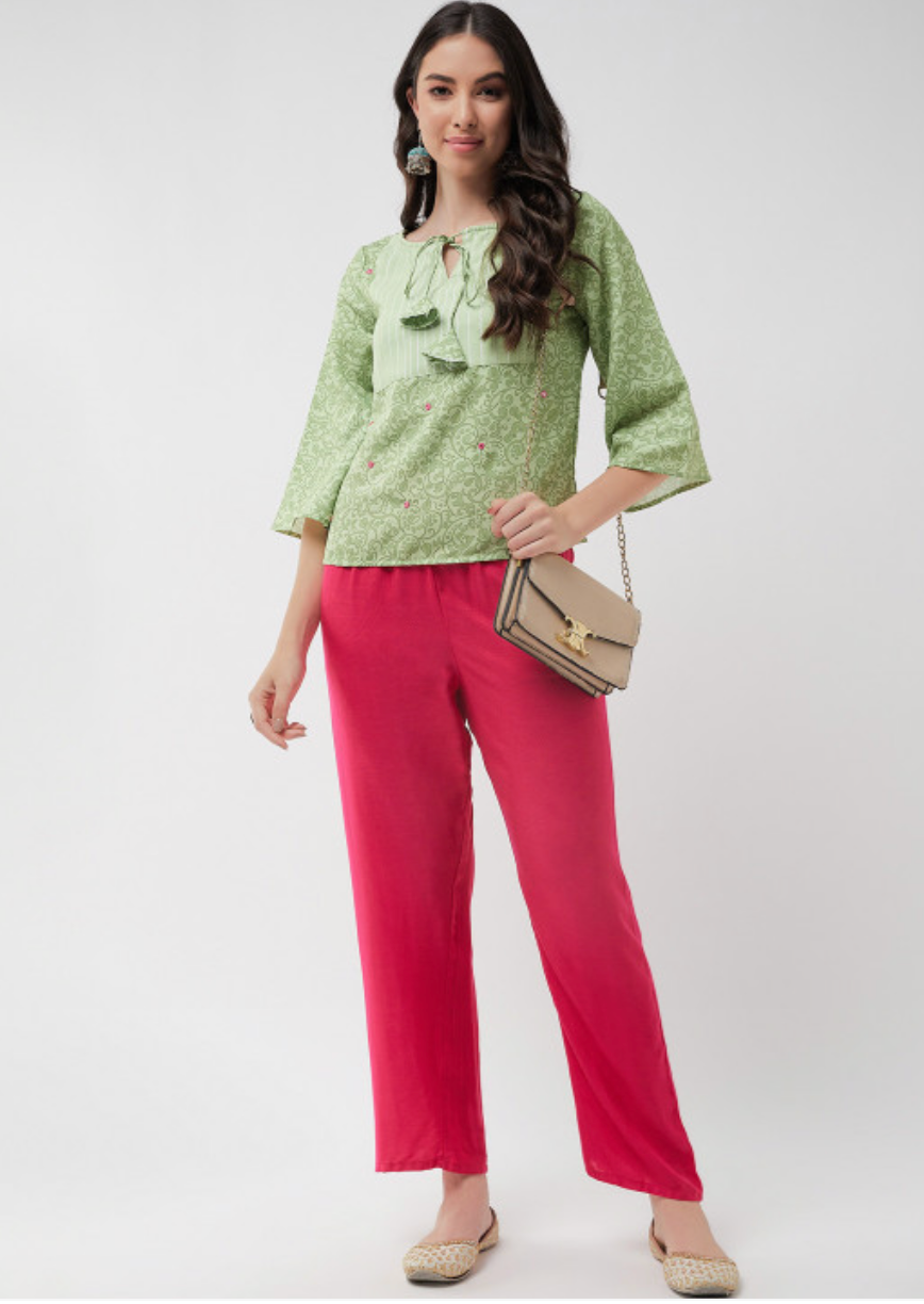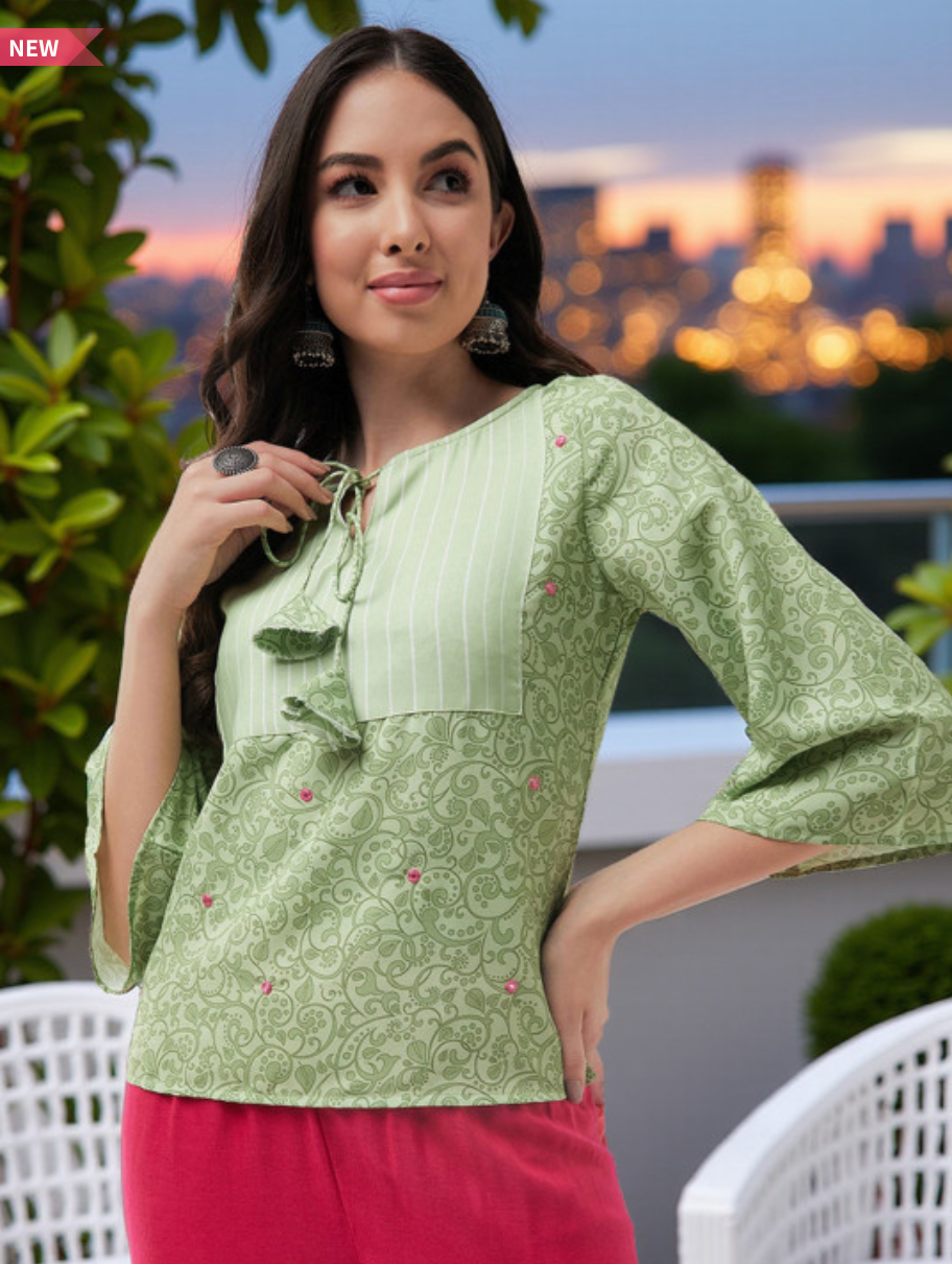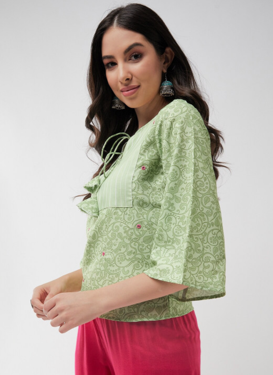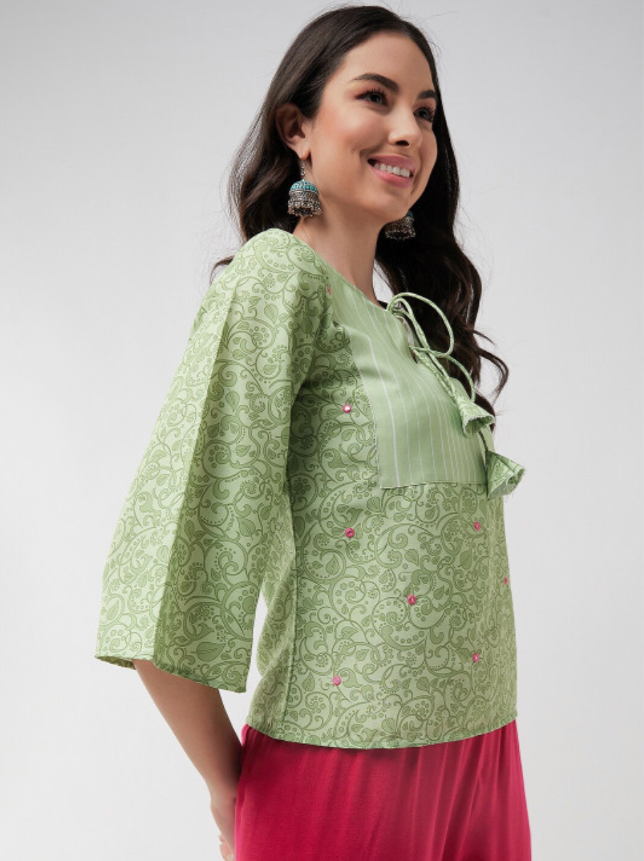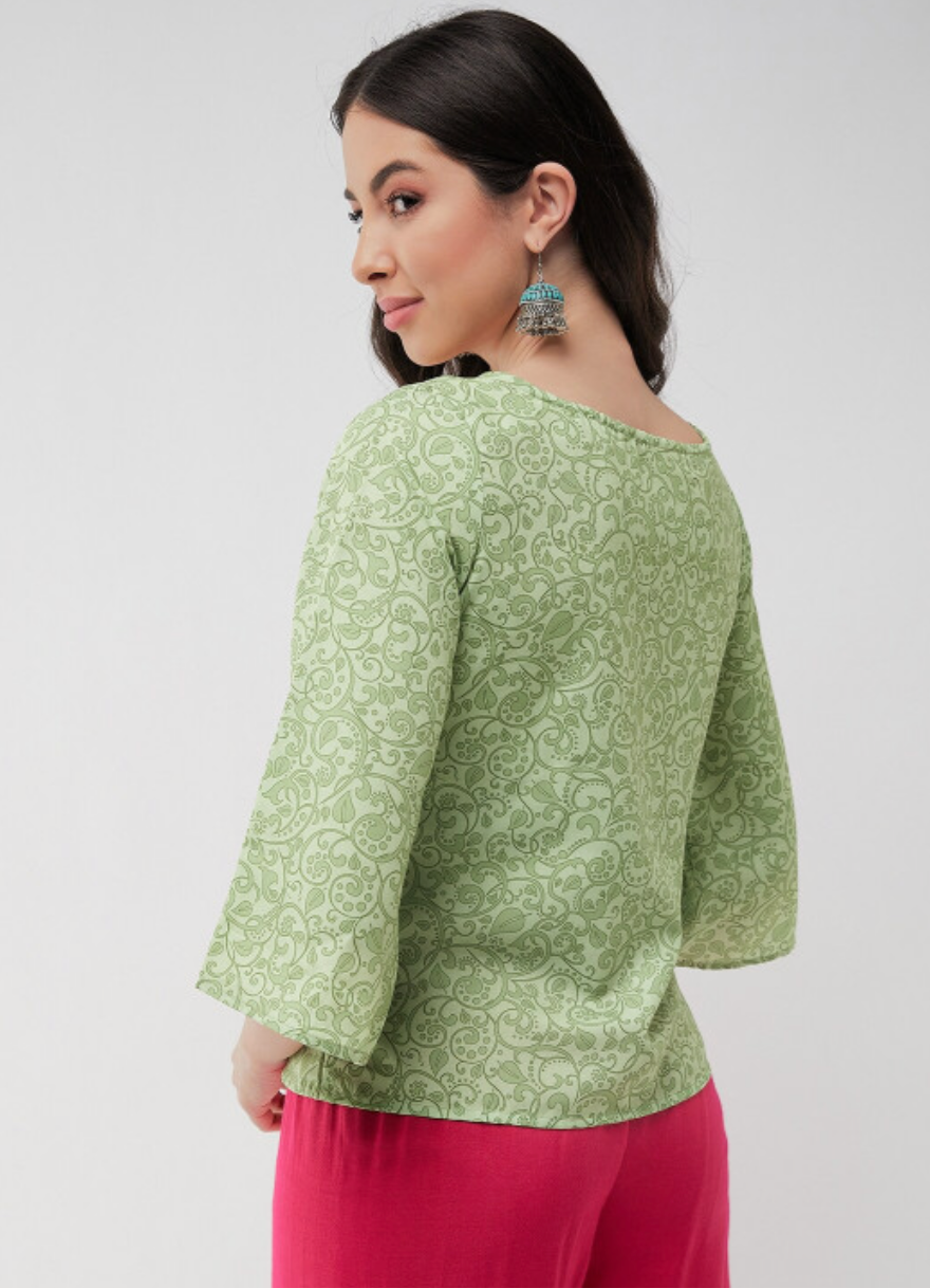Green regular floral print top with a tie-up neck, three-quarter flared sleeves, and woven fabric.