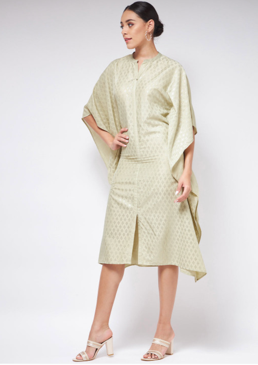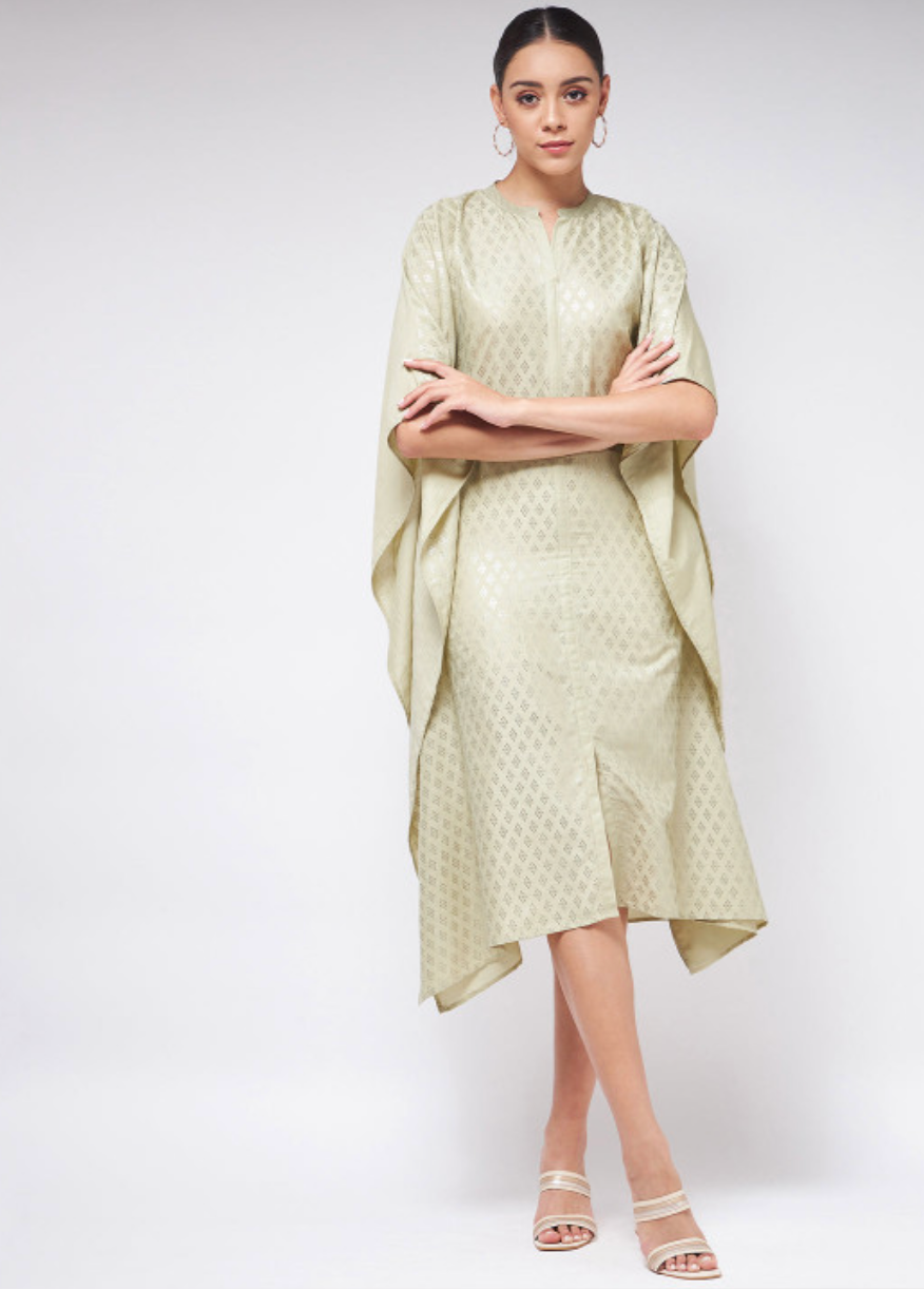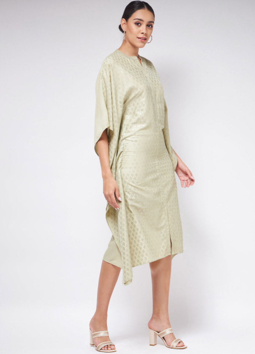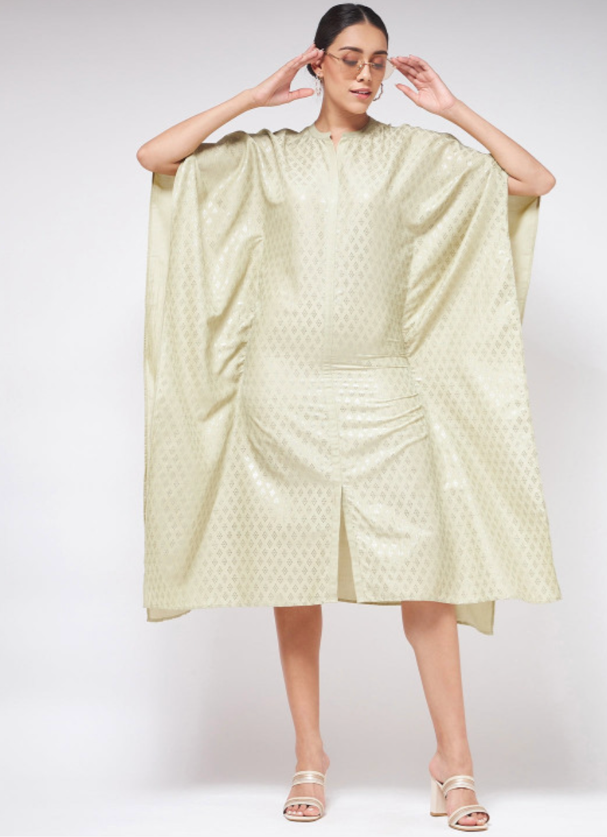 Off-white self-design kaftan dress with a V-neck, three-quarter kimono sleeves, and knee-length in a straight hem.