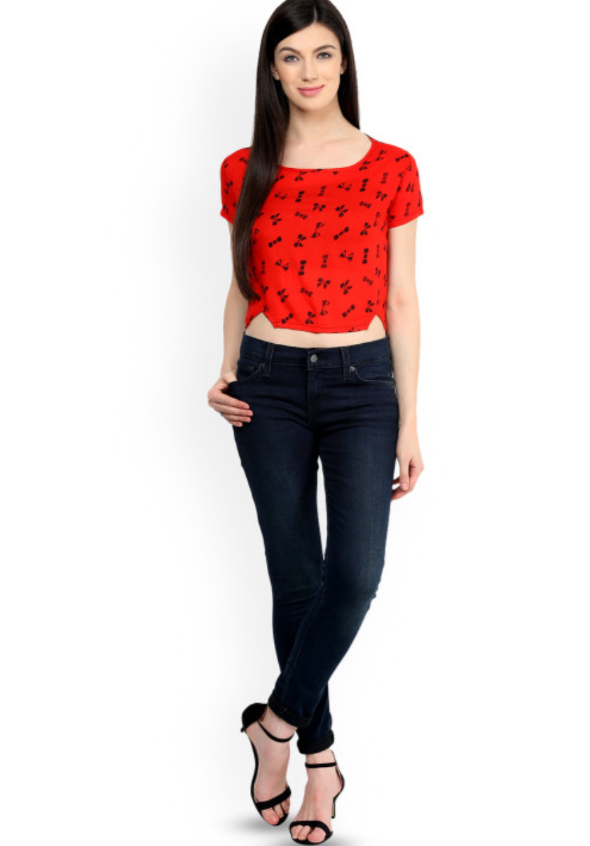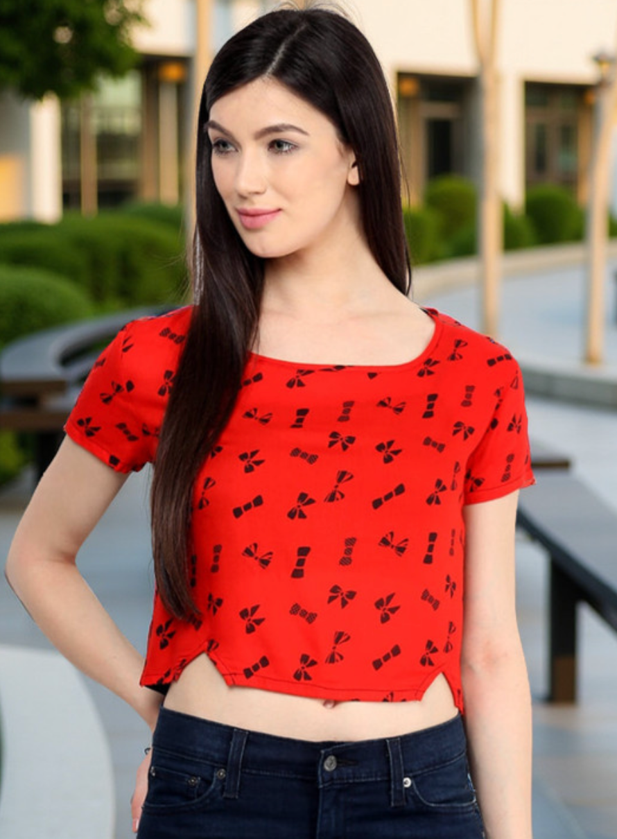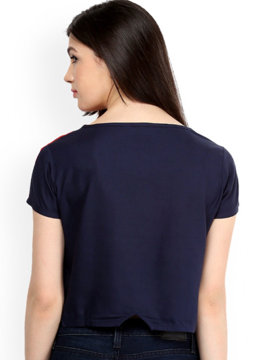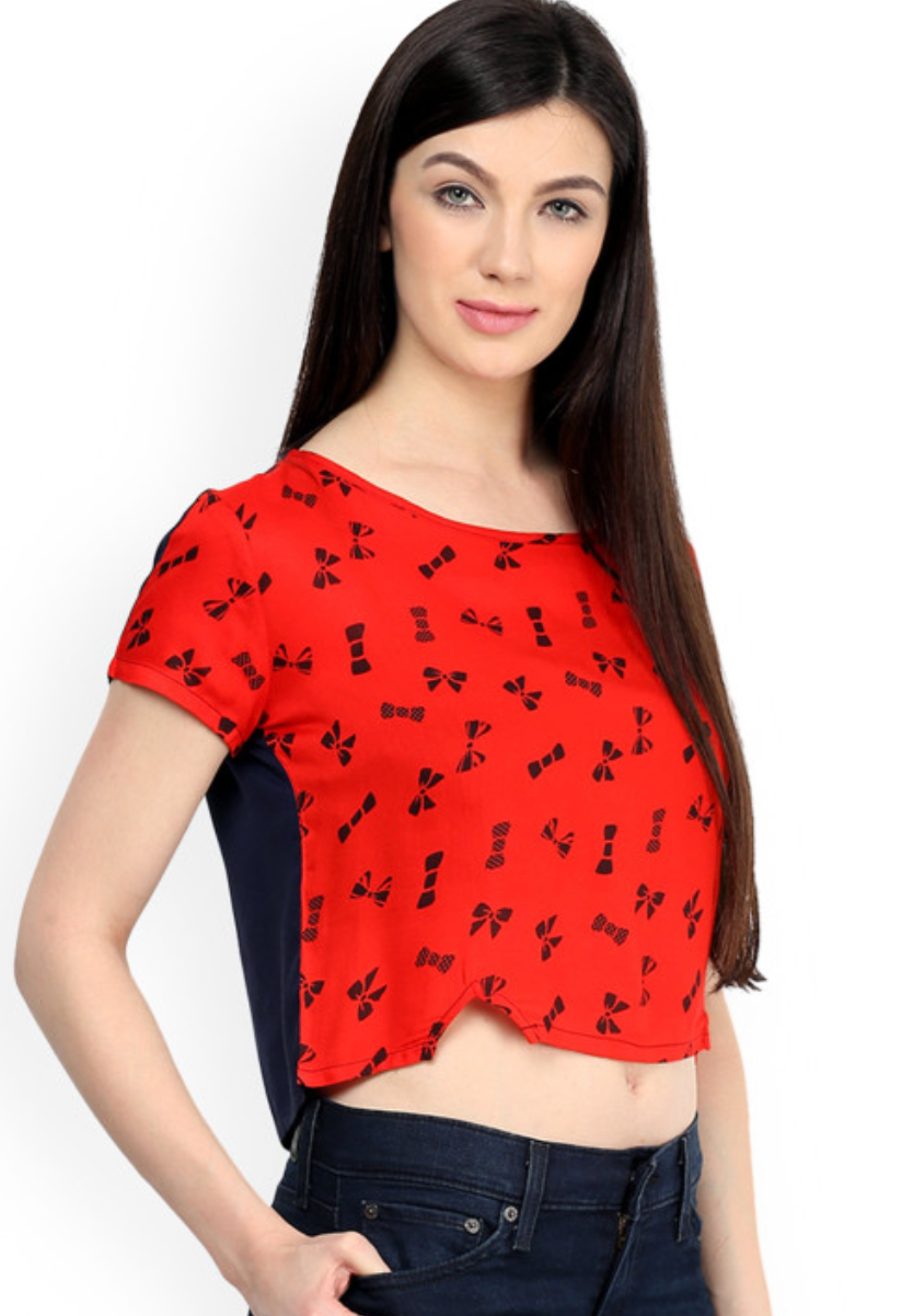 Red and navy blue printed woven regular crop top, has a round neck, short sleeves