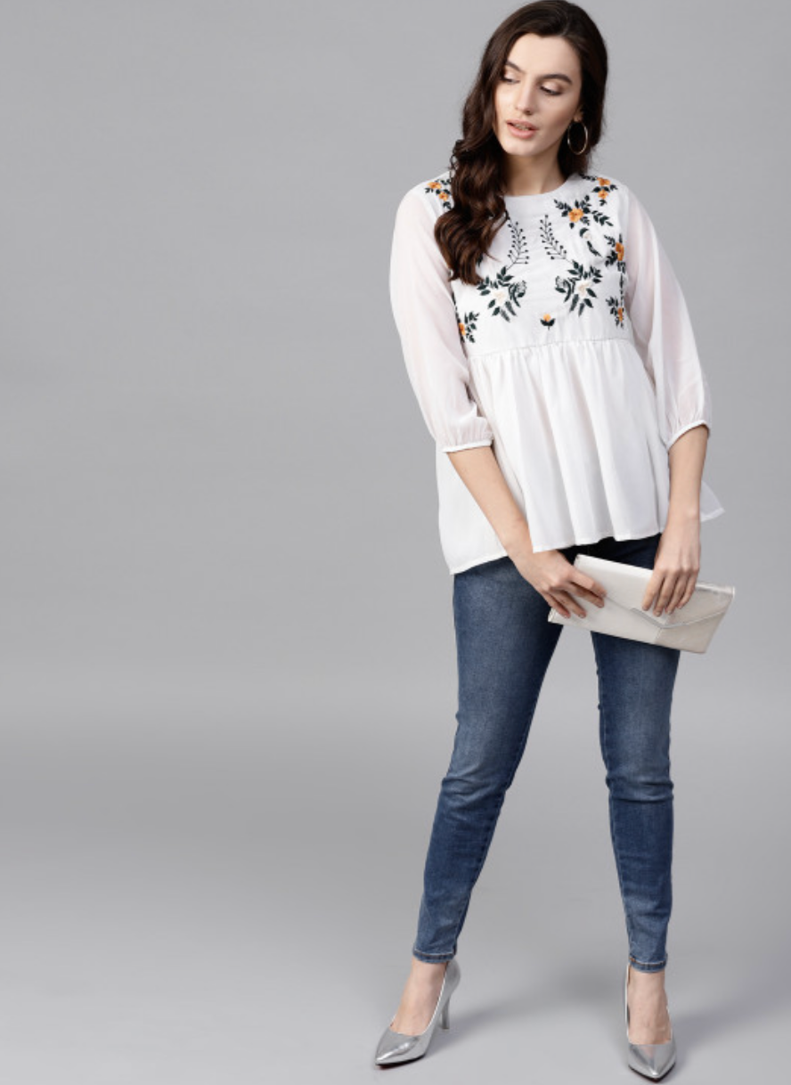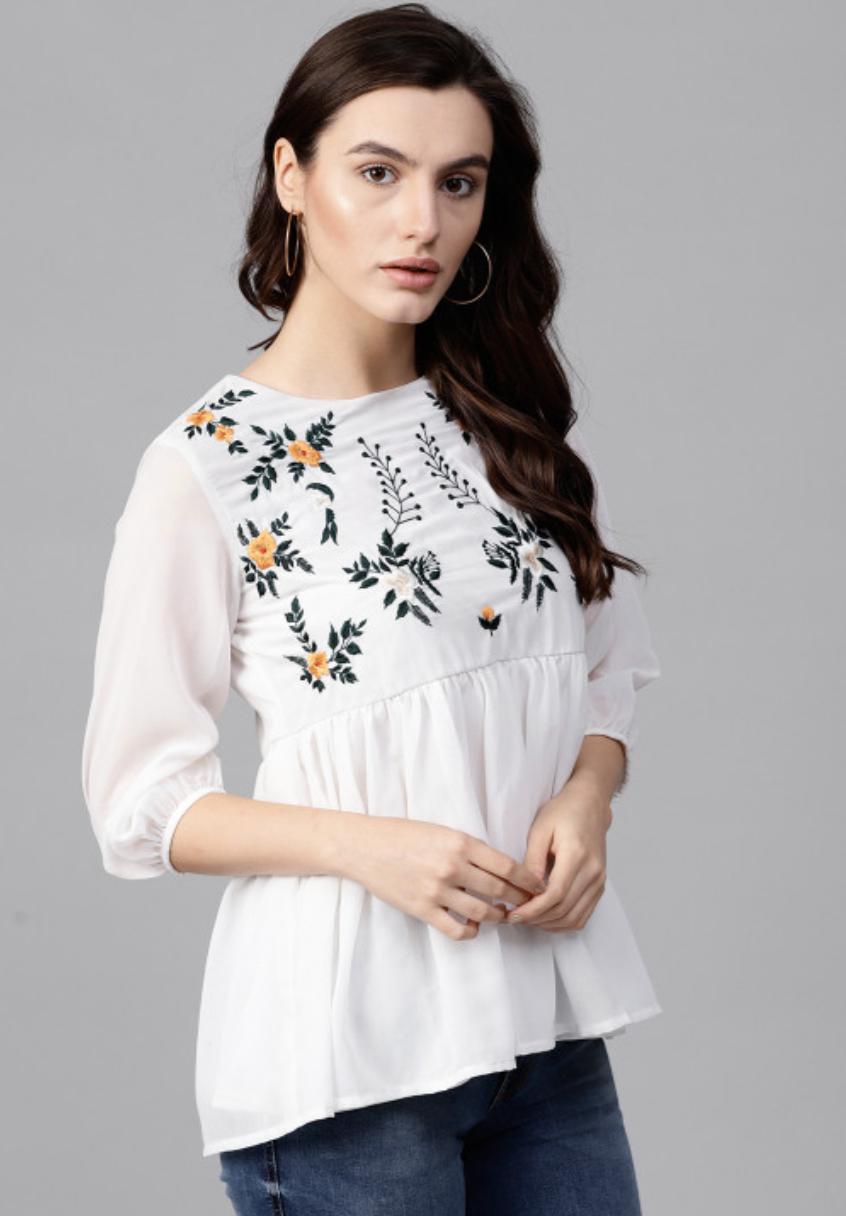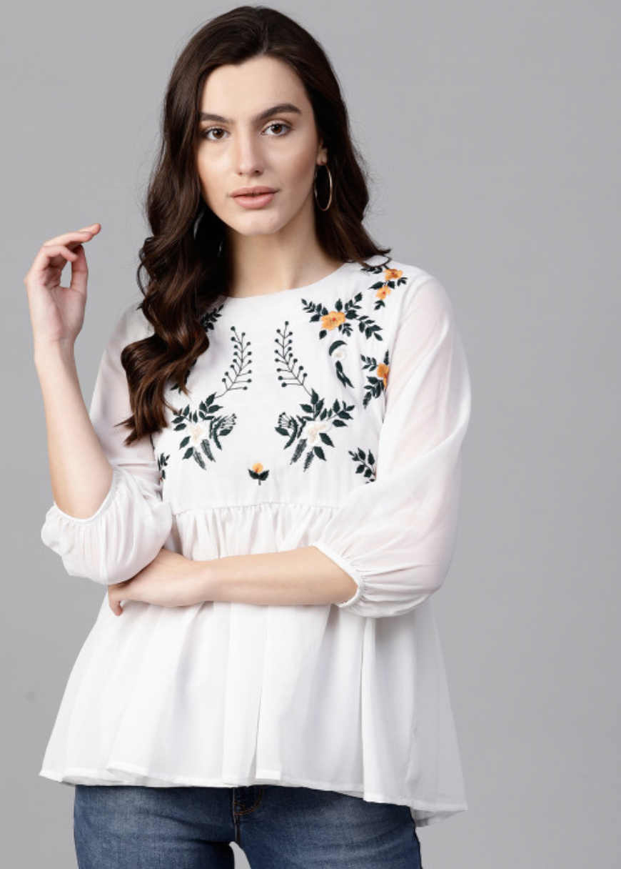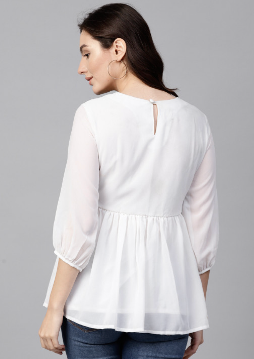 White embroidered woven A-line top, has a round neck, three-quarter sleeves, button closure