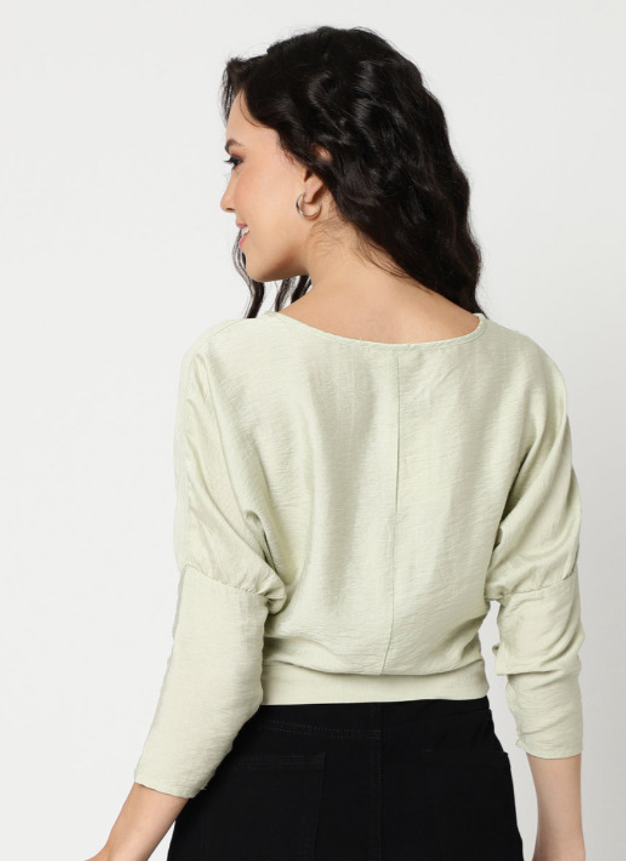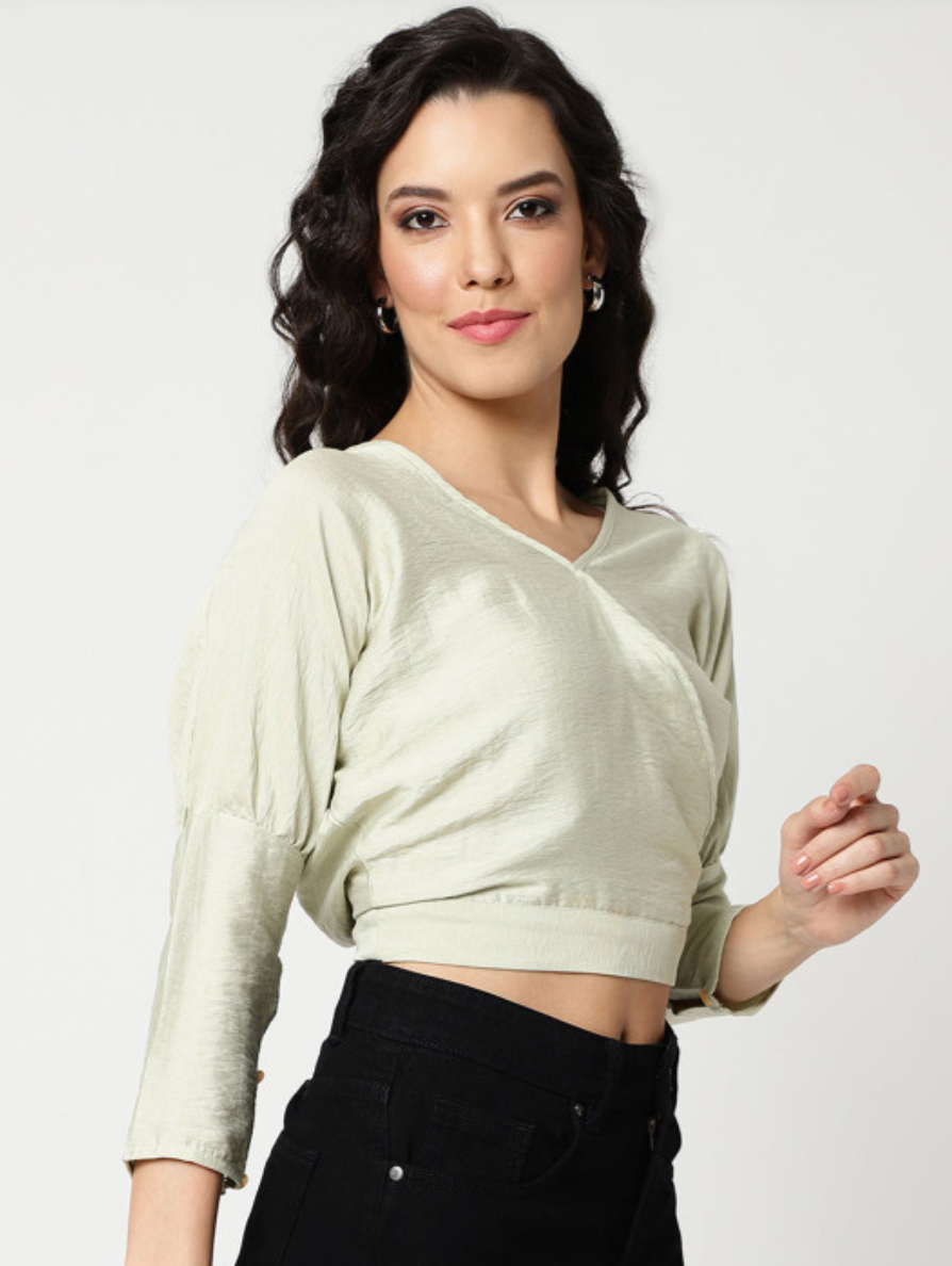 Green solid crop wrap top with a V-neck, three-quarter regular sleeves, and woven fabric.